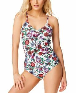Figure flattering with ruched detail, this Jessica Simpson tankini will quickly become a waterside favorite. Pair it with the matching hipster swim bottoms for an allover delicate floral design, or style with a solid print bikini bottom to draw attention up towards your face.