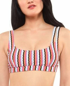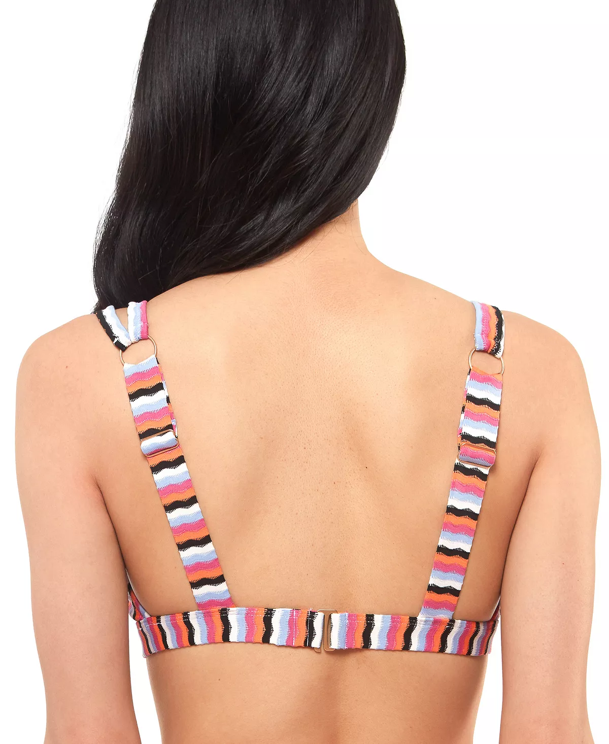 Jessica Simpson’s textured bikini top throws it back, vintage-style. Modern twists like wide split straps and ring hardware complete the look.